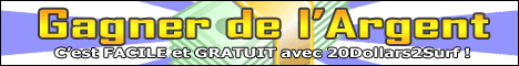 20dollars2surf est un site qui vous permet de gagner de l'argent gratuitement ! Le système de base est celui de la barre de surf rémunérée. En échange d'une publicité qui défilera sur votre bureau, vous recevrez des points qui seront convertis en dollars. Après votre inscription sur le site, il vous faudra télécharger la barre de surf. Ne vous inquiétez pas, le téléchargement est très simple et rapide. Ensuite, il vous faudra installer la barre de surf. Vous devrez cliquer à deux reprises sur le fichier téléchargé et débuter l'installation. 20dollars2surf est un des sites les plus complets de barre de surf et se classe actuellement premier dans le domaine !