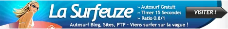 La Surfeuze est un site très intéressant vous permettant de générer de nombreux visiteurs sur votre site internet, blog, forum, page, etc. Vous souhaitez apporter à votre site une nouvelle vague de nouveauté et vous souhaitez pour cela amener un maximum de visiteurs, n’hésitez pas à tester La Surfeuze. Grâce à son autosurf sans frame, vous allez répandre votre site à des milliers de personnes. Pour cela, rien de plus simple qu’une petite inscription ! Vous n’aurez donc qu’à visiter des sites et vous recevrez en échange des visites sur votre site internet. Sachez que lors de votre inscription, vous recevez déjà gratuitement 1.000 crédits qui correspondent en réalité à 1.000 visites sur votre site ou blog.